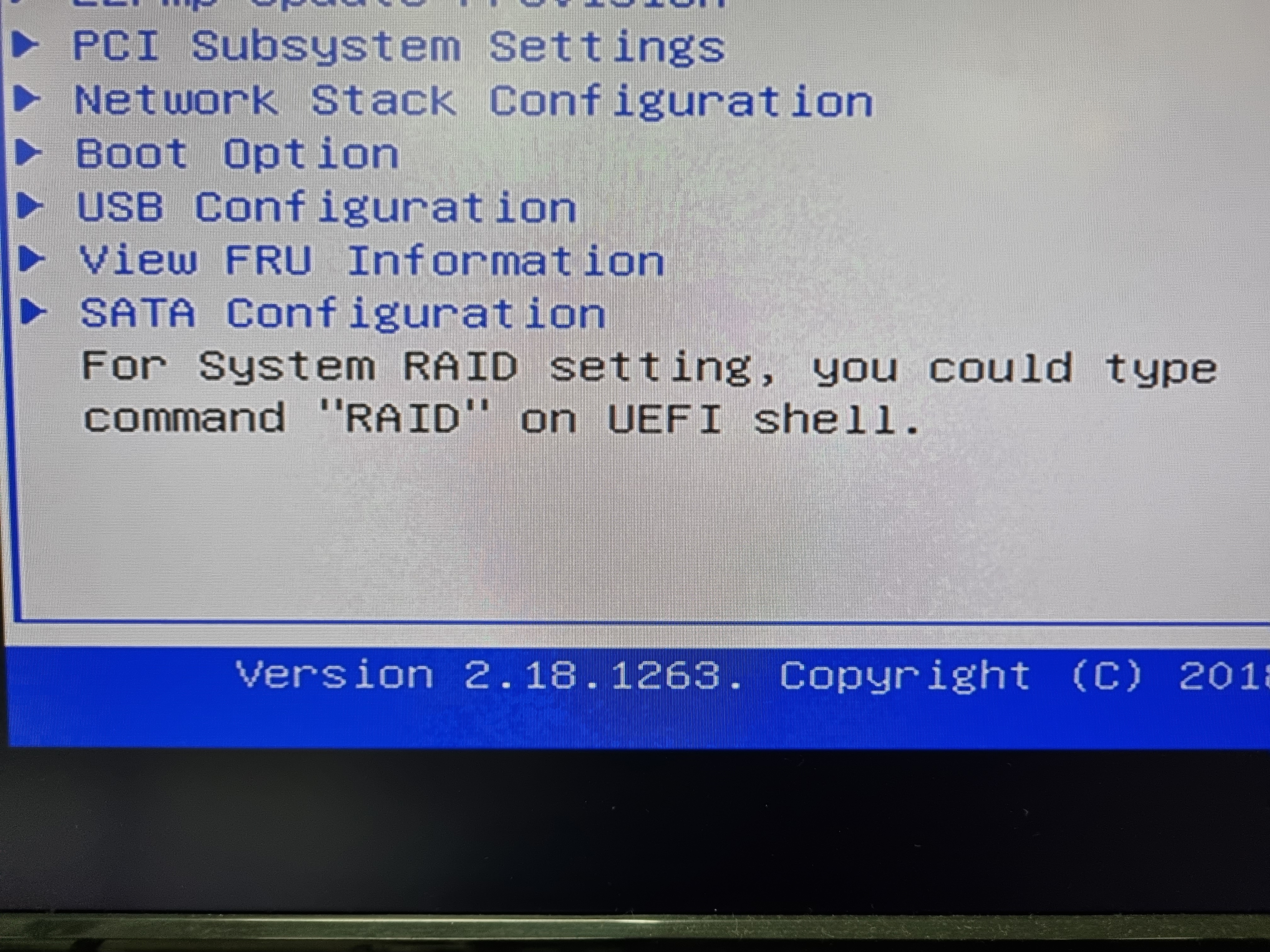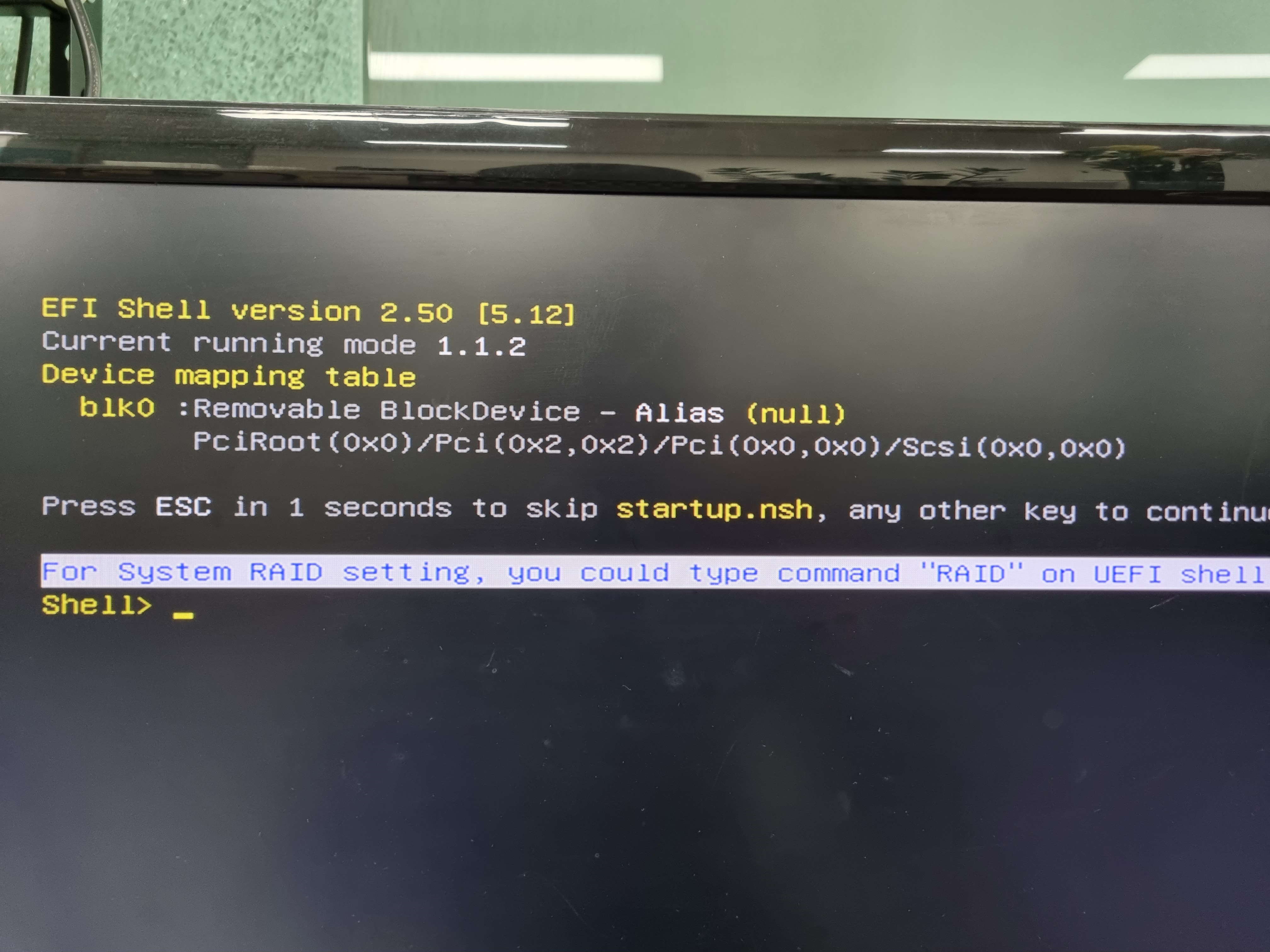 IDE Configuration 항목은 없고 "For System RAID setting, you could type command "RAID" on UEFI shell." 문구가 보인다. UEFI shell에서 RAID 명령어를 통해 셋팅이 가능하다는데 방법을 알아보자.